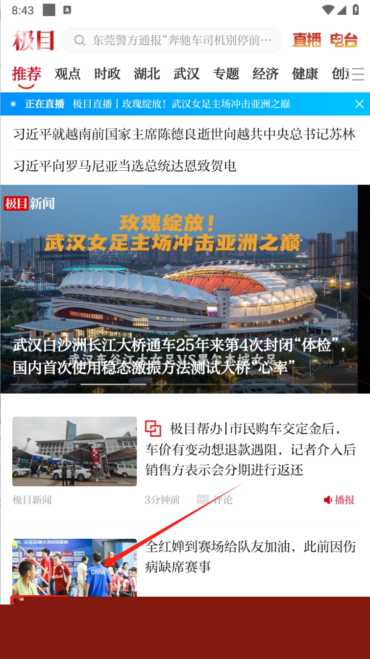 1、打开极目新闻软件,进入首页,您可以浏览推荐的新闻和直播内容,了解当前的热点事件。