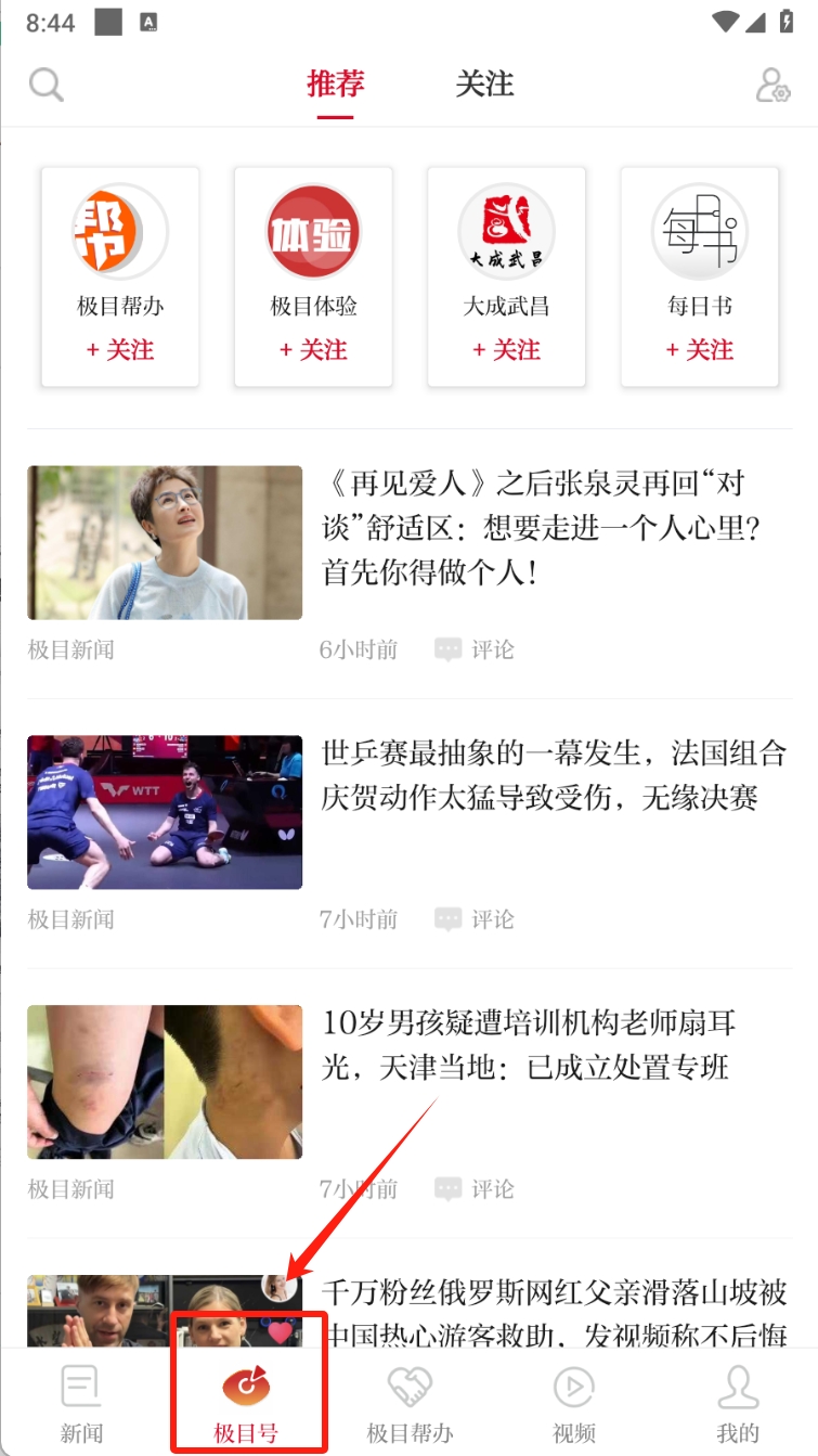 2、在推荐页面,您可以关注感兴趣的账号,如“极目帮办”、“极目体验”等,以便获取更多个性化的新闻推送。