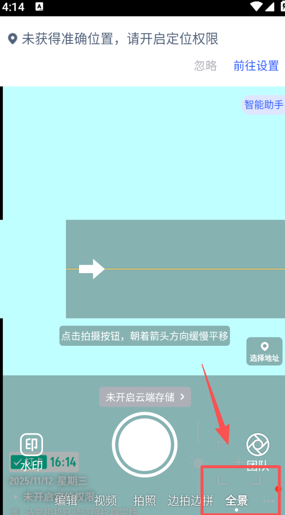 3、点击 “全景” 功能,按照提示朝着箭头方向缓慢平移拍摄,可制作全景照片。