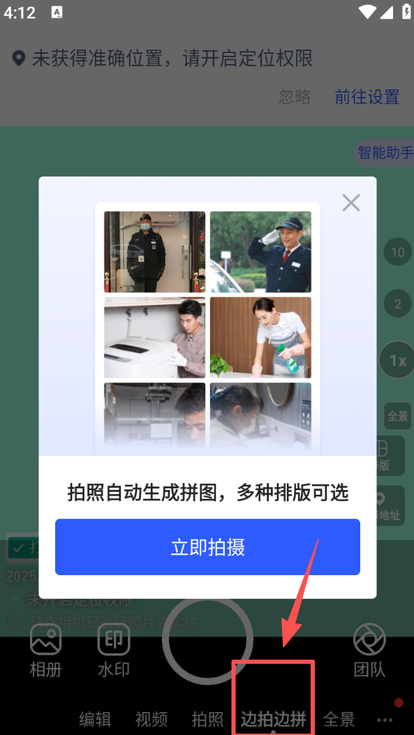 2、切换到 “边拍边拼” 功能,点击 “立即拍摄”,可拍摄并自动生成拼图,有多种排版可选。