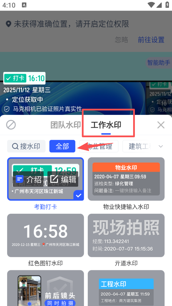 1、在水印选择界面,点击 “工作水印”,可选择考勤打卡、物业水印等多种工作类水印。
