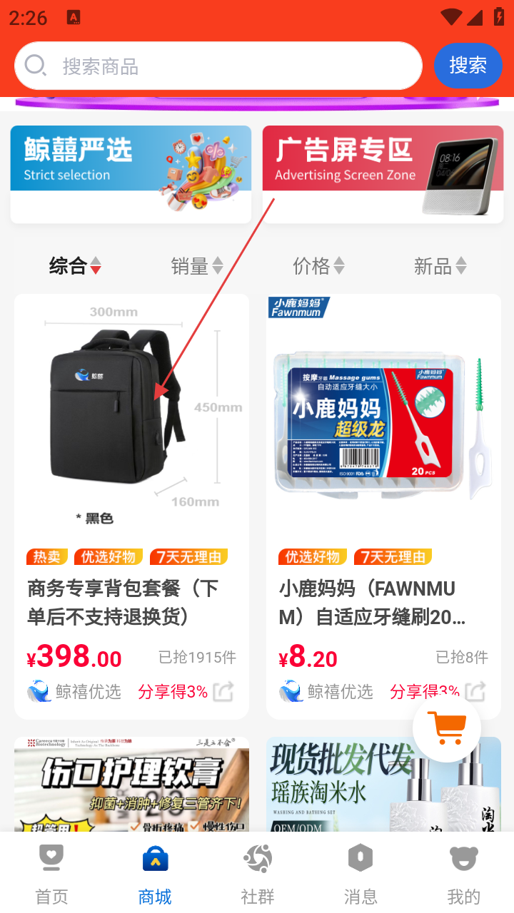 2、商城选商品(如商务背包),进入商品详情页。