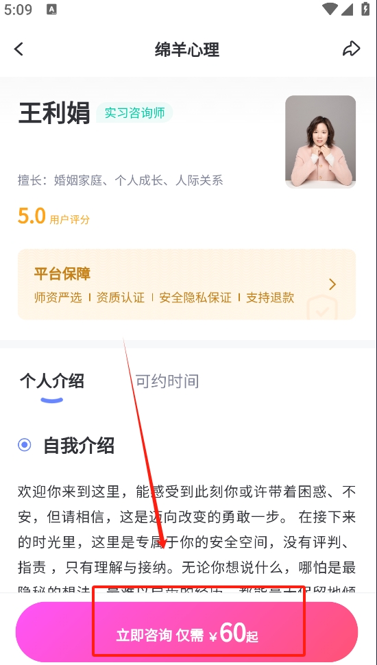 4、点击咨询师头像,击“立即咨询”按钮进行预约。