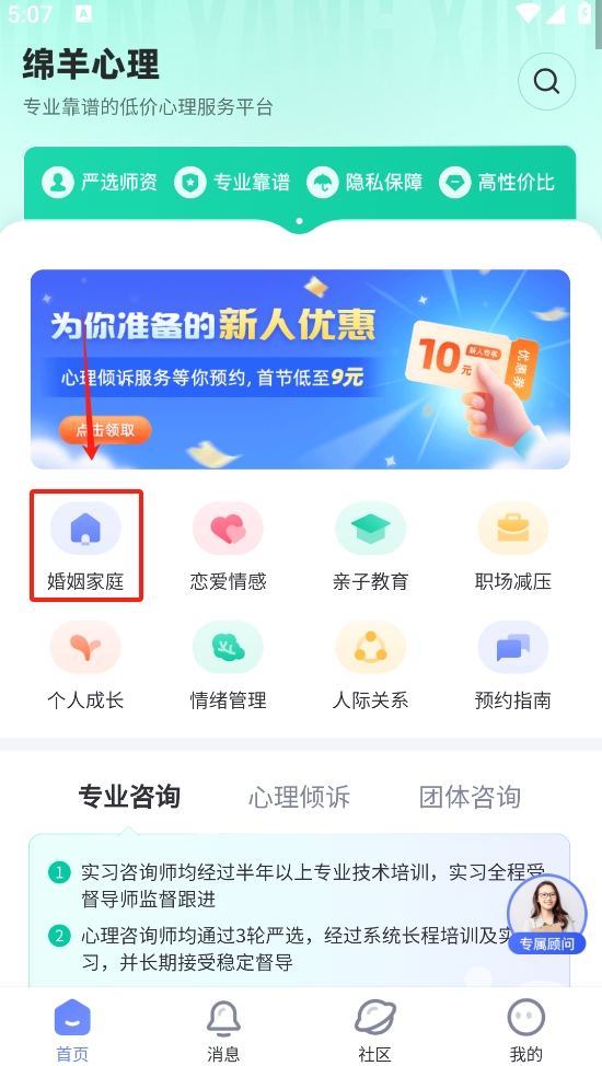 1、进入首页,点击“婚姻家庭”图标,选择需要的咨询服务类别。