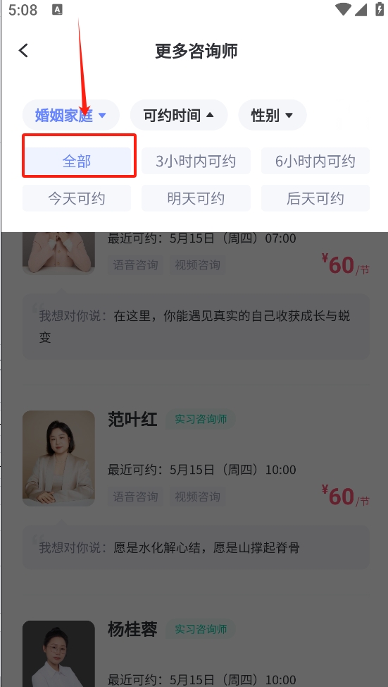 3、根据性别筛选咨询师,选择“全部”查看所有性别的咨询师。