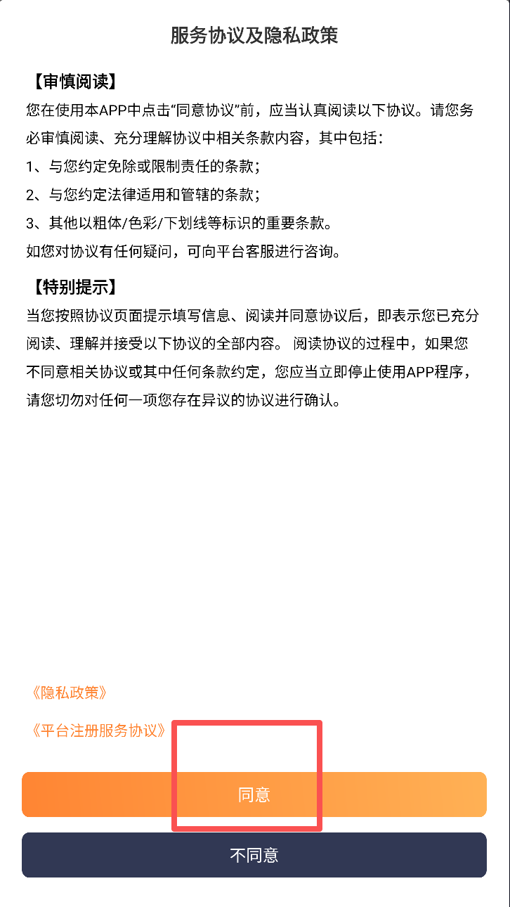 1、仔细阅读并同意服务协议及隐私政策。点击“同意”按钮继续注册流程。