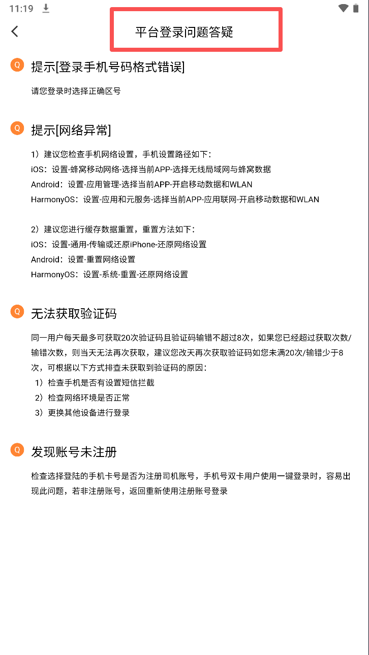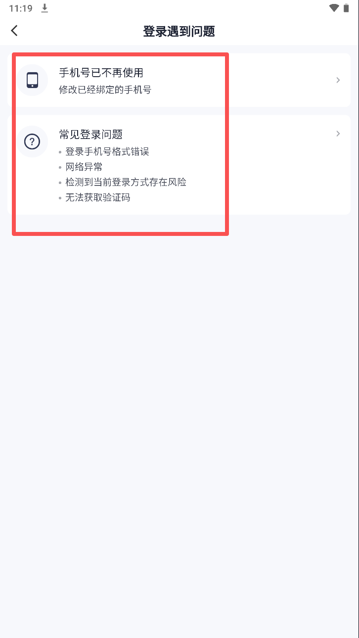 3、若登录遇到问题,选择对应问题进行解决,如修改手机号或检查网络设置。