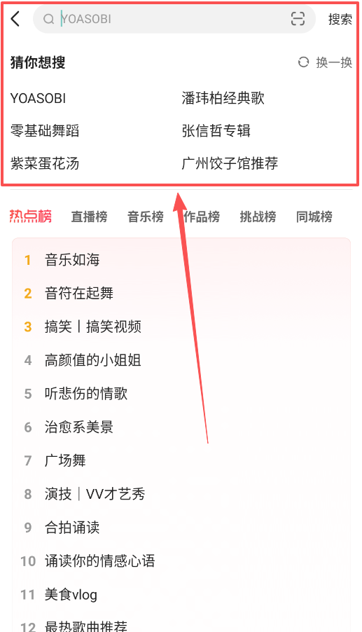 3、在搜索页面能看到猜你想搜和各类热点榜单,热点榜包含直播、音乐、作品等五个垂直榜单,如果不知道玩什么。