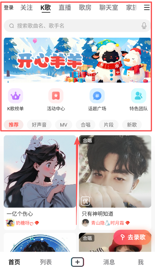 2、登录后进入首页,可以看到底部有首页、列表、加号、消息和我五个主要导航栏,上方还能直接搜索歌曲或歌手。