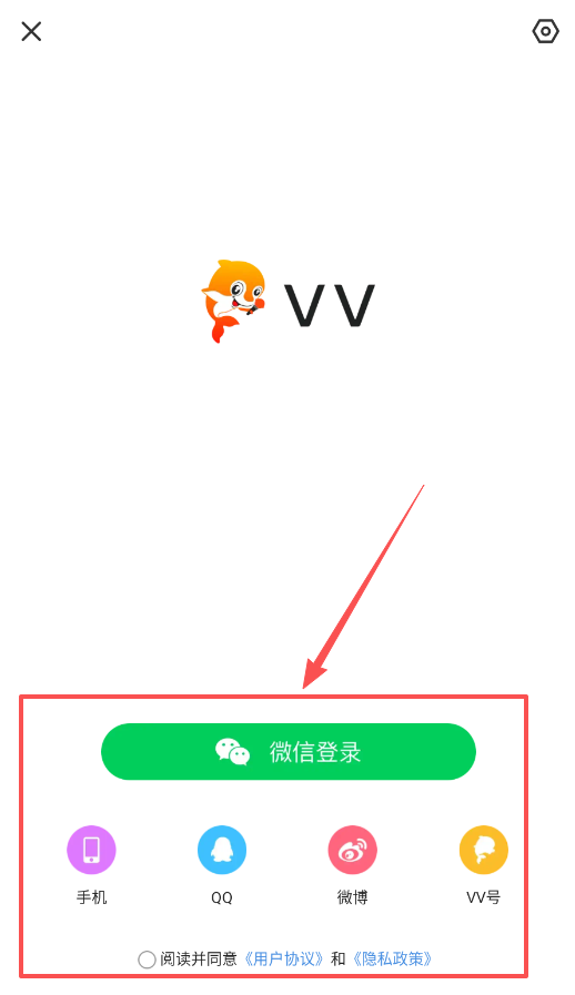 1、首先打开VV软件,在登录界面可以选择手机号、QQ、微博或VV号等多种方式快速登录,这样才能顺利进入主界面开始使用呢。