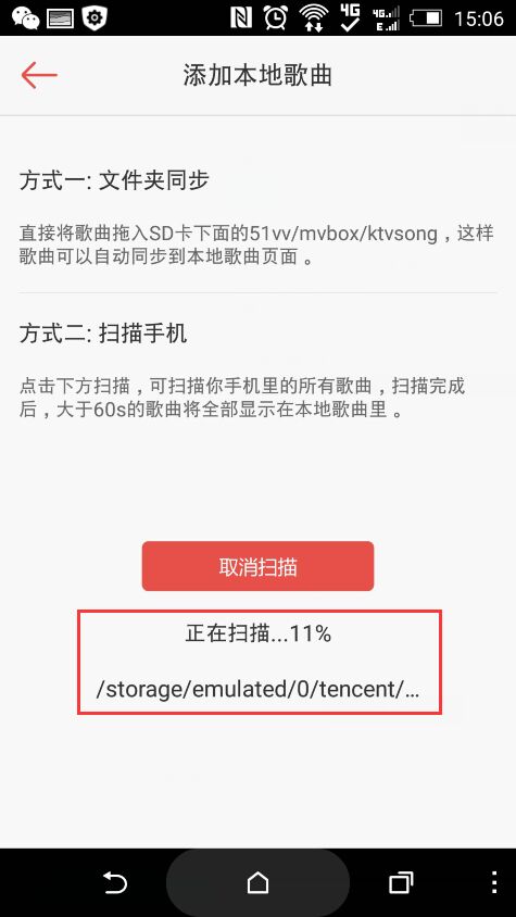 方法一指:使用数据线连接手机与电脑,然后找到手机(或SD卡)上的51vv/mvbox/ ktvsong目录,将电脑上下载好的伴奏放入此目录下,之后再次打开本地歌曲,就会自动显示出刚才放入的伴奏了。