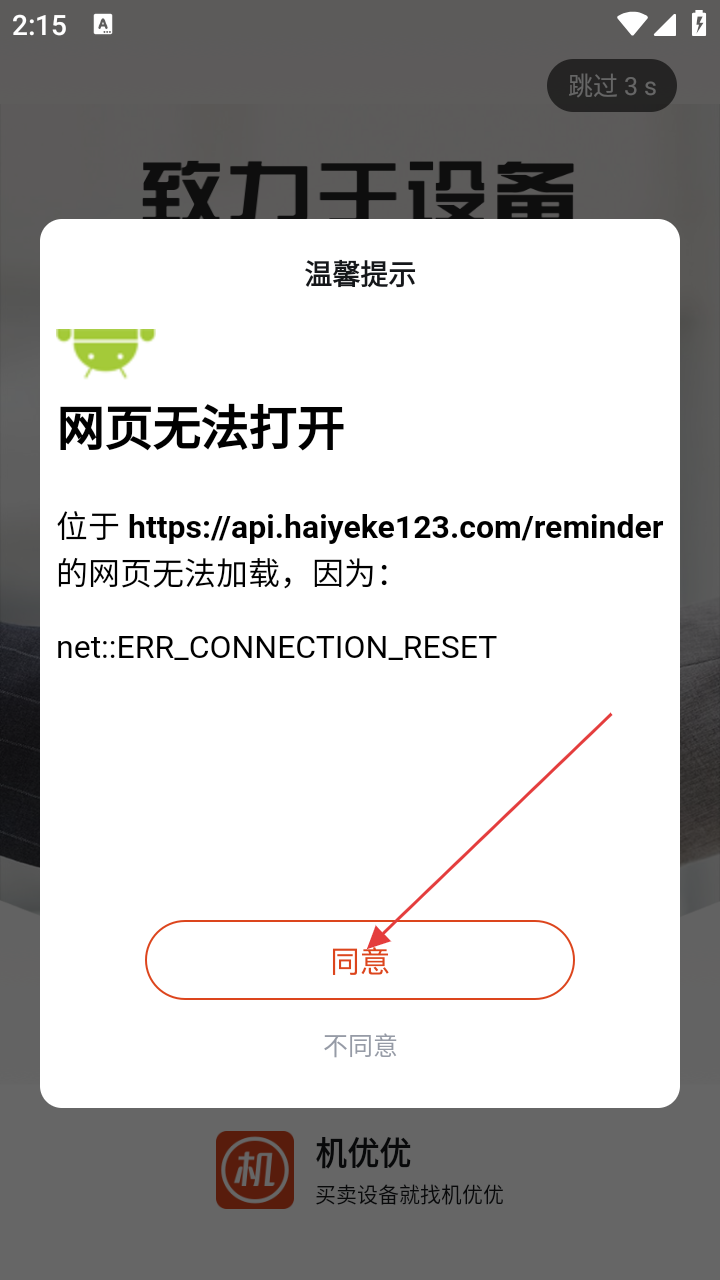 1、打开应用,查看温馨提示,点击【同意】按钮关闭弹窗继续操作。