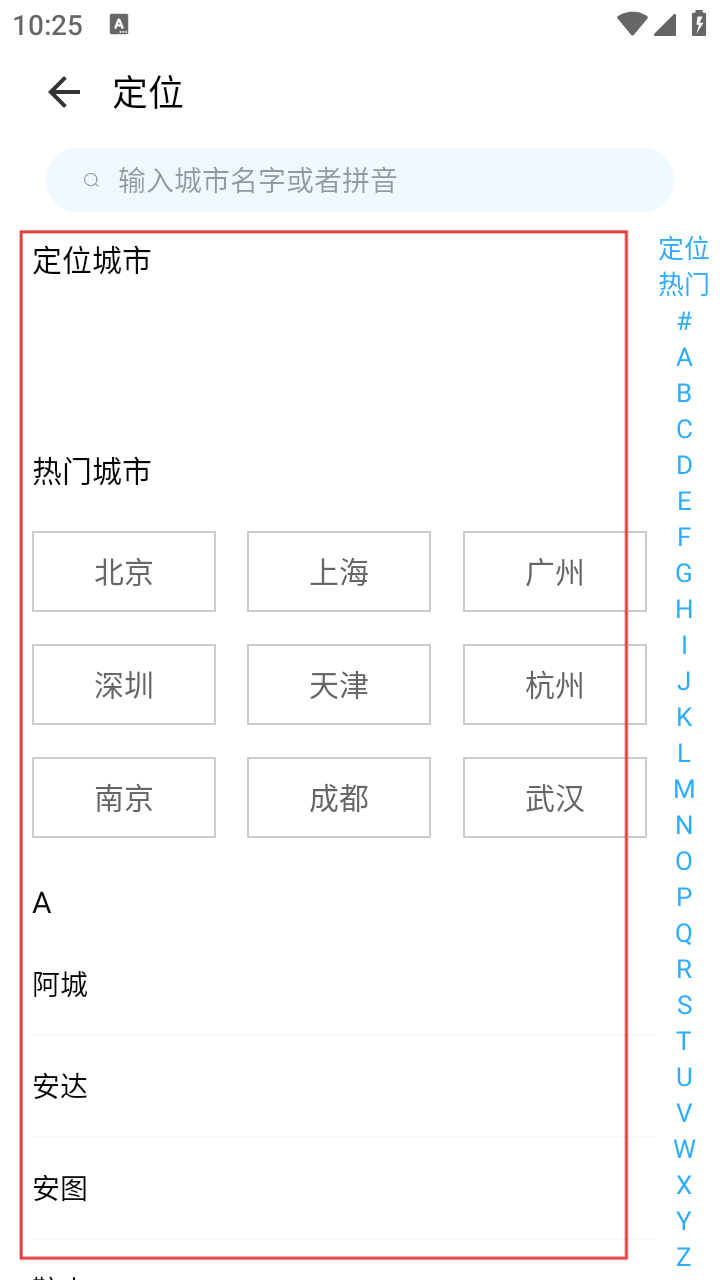 4、到【定位】界面,能选热门城市或输入名称,快速切换天气定位。