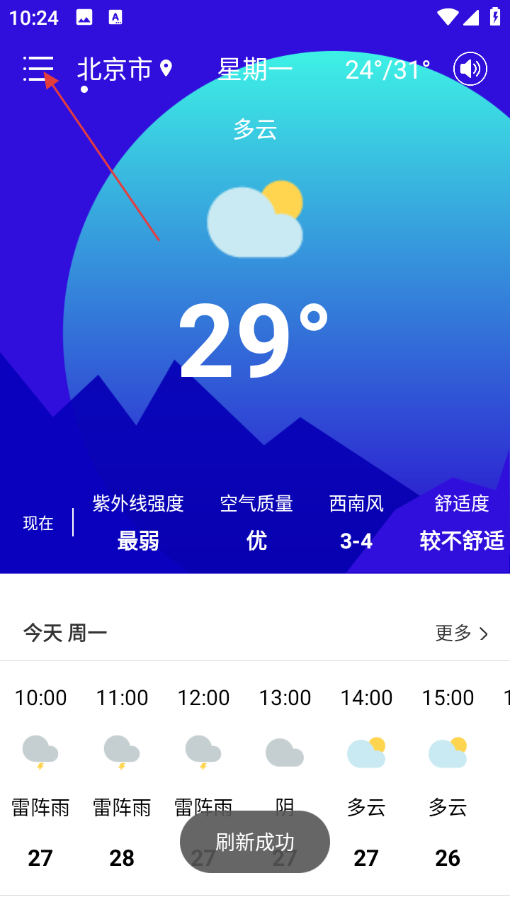 1、在天气主界面,点击左上角【三条横线】图标,进入设置等功能页面。