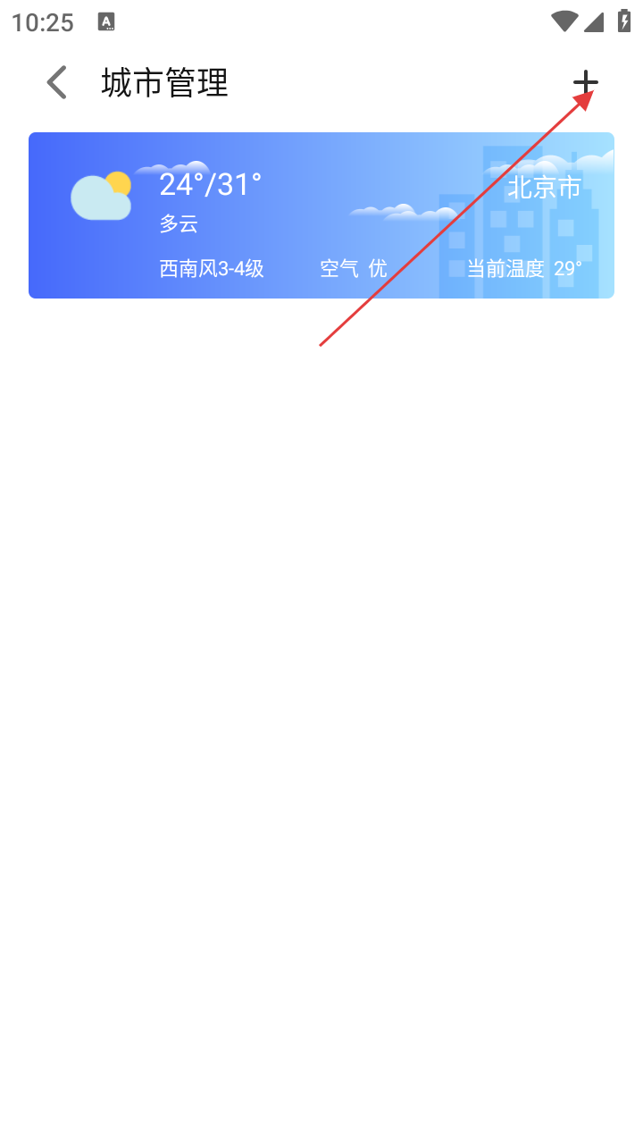3、在【城市管理】页,点右上角【+】号,可添加新城市天气查看。