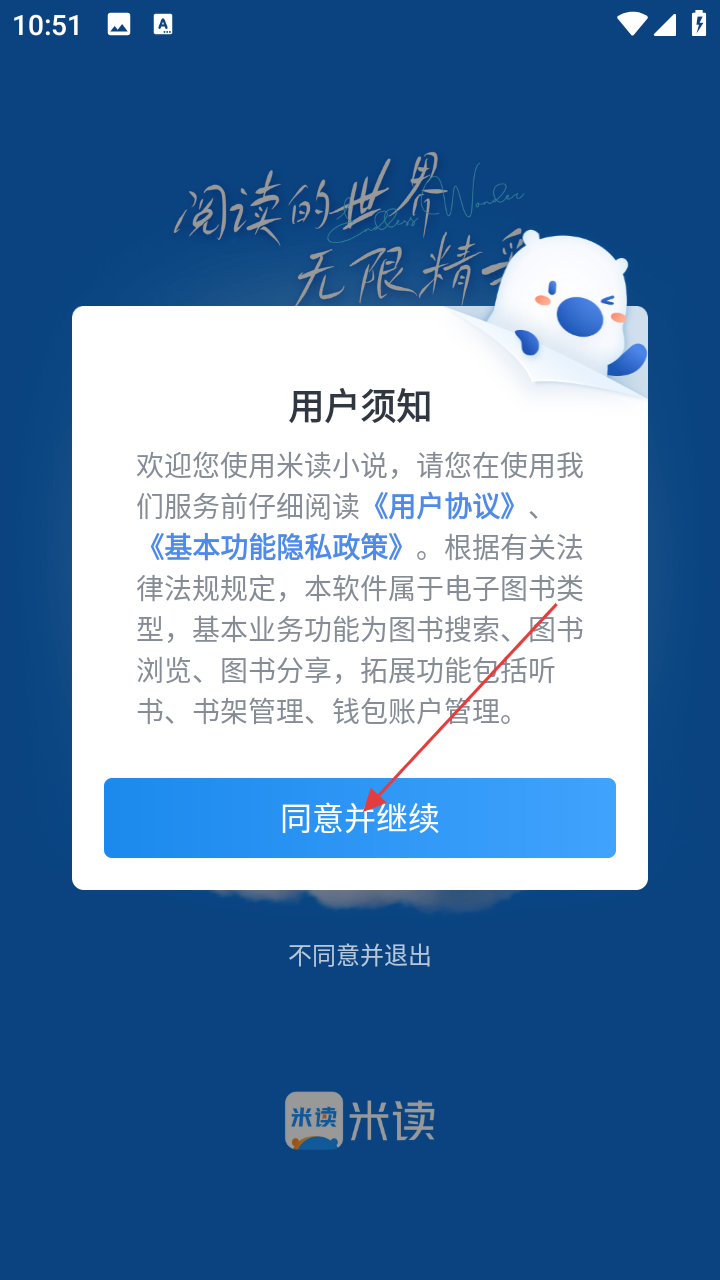 1、打开米读小说APP,首先看到用户须知页面,点击【同意并继续】按钮。