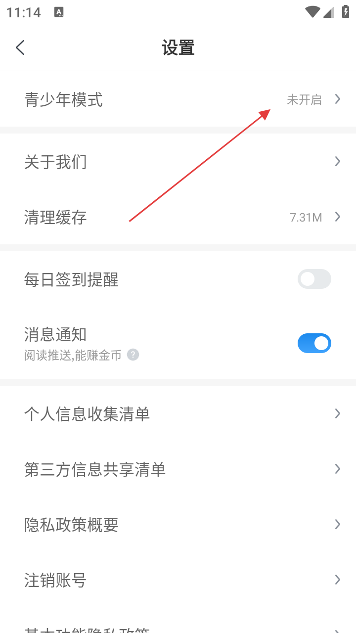 4、进入设置页面后,点击【青少年模式】选项,按照提示进行操作,即可开启青少年模式。