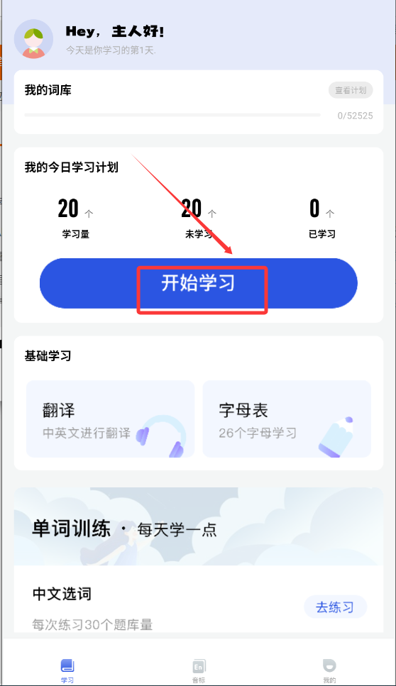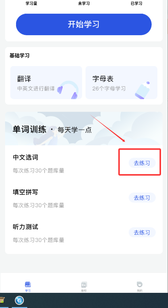 1、进入学习模块选择适合自身水平的课程,每日完成系统推荐的单词记忆和语法练习任务。