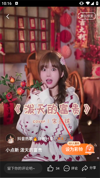 3、在【视频彩铃榜】详情页,选择目标作品如【小点新-泼天的富贵】,点击该作品卡片进入其播放详情页。