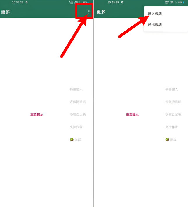 进入“更多”页面后,点击右上角的三个小圆点图标,就能找到导入规则的选项了。