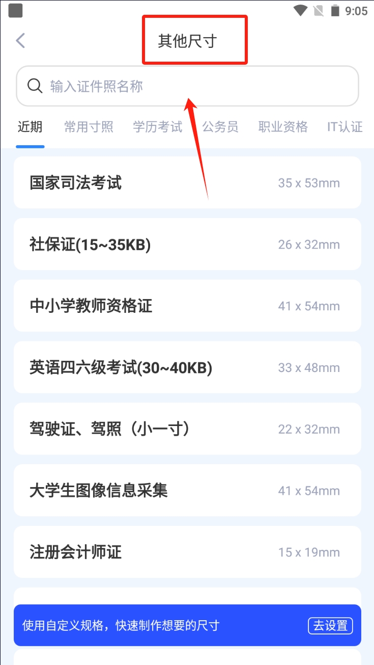 2、查看其他尺寸、点击“其他尺寸”选项,浏览更多证件照尺寸,选择适合您需求的尺寸。