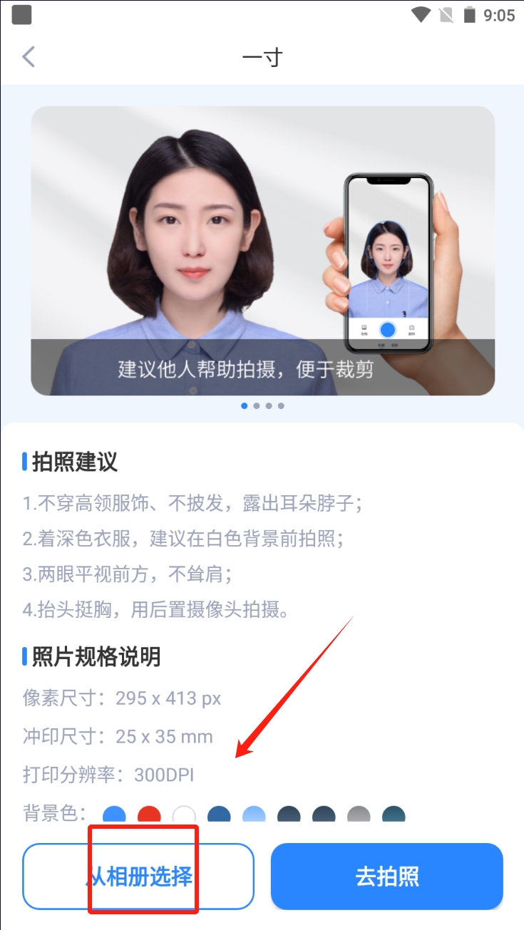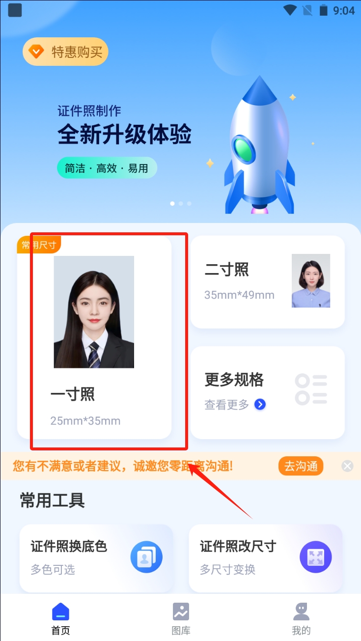 1、选择证件照尺寸、在首页选择“一寸照”或“二寸照”等常用尺寸,点击“更多规格”查看其他尺寸。