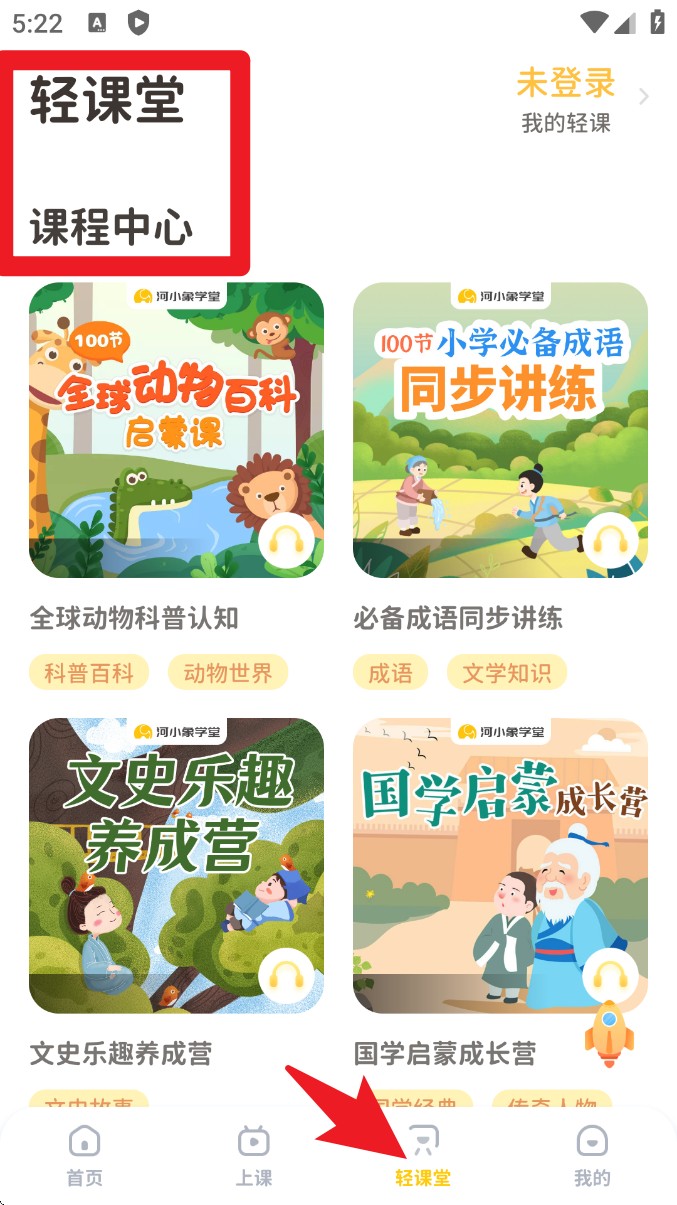 4. 切换至轻课堂,浏览海量启蒙课程内容,包括动物百科、成语讲练、文史兴趣营等,适合拓展课外知识。