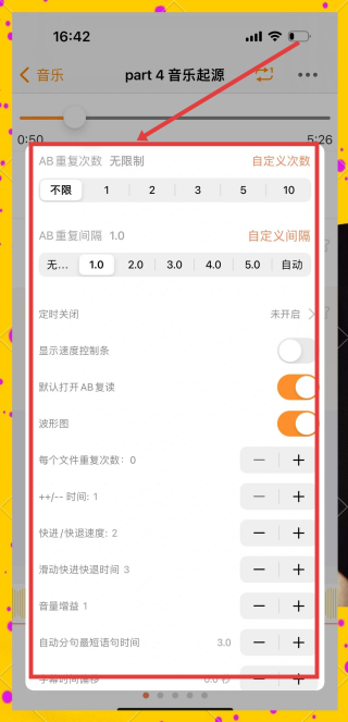 3、在设置界面中,针对part4的音乐起源音频,能够对AB重复次数、间隔时长等各类播放参数进行调整。