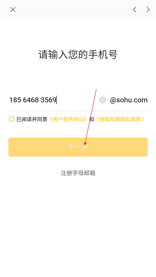4、输入手机号码并勾选同意相关协议后,点击【下一步】即可继续完成搜狐手机号码邮箱注册流程。