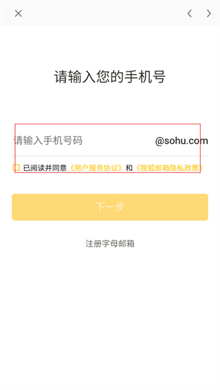 3、注册手机号码邮箱时,需在指定输入框输入手机号码,且要勾选同意【用户服务协议】和【搜狐邮箱隐私政策】。