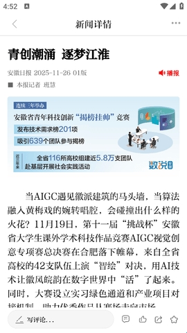 安徽日报电子版是安徽日报社的官方客户端app,一款主打政经新闻、政务服务的新闻资讯类软件,平时喜欢看报读新闻的朋友推荐下载使用,这个平台能为你带来最新最热的一手新闻内容,并且所有内容都是通过官方渠道获取,并进行了精细的整理,内容书写质量相当之高,需要的朋友欢迎安装下载!