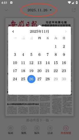 3、如果你要看前几天的报纸,可以点击上面的时间查找。