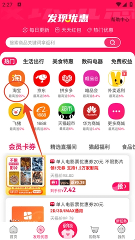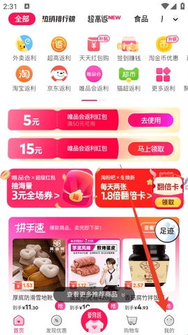 3、往下翻下面有很多折扣商品或者返利商品,看看有没有你要买的,没有的话直接去搜索。
