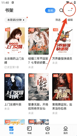 1、进入“书架”页面,点击右上角三个点按键。