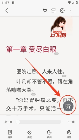 3、轻点一下就能唤起阅读器的菜单了,然后你就能看到一个大写的“听”,点一下。