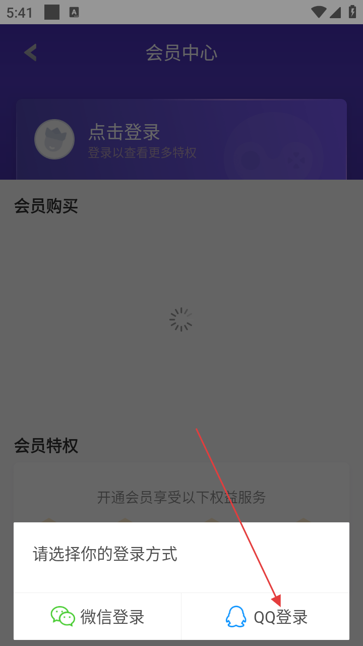 4、在登录方式选择界面,点击【QQ登录】,选择QQ账号进行登录,以查看更多会员特权。