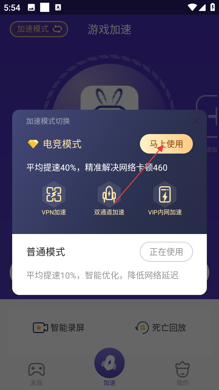 2、在加速模式切换界面,点击电竞模式的【马上使用】,可切换为电竞加速模式,提升游戏加速效果。