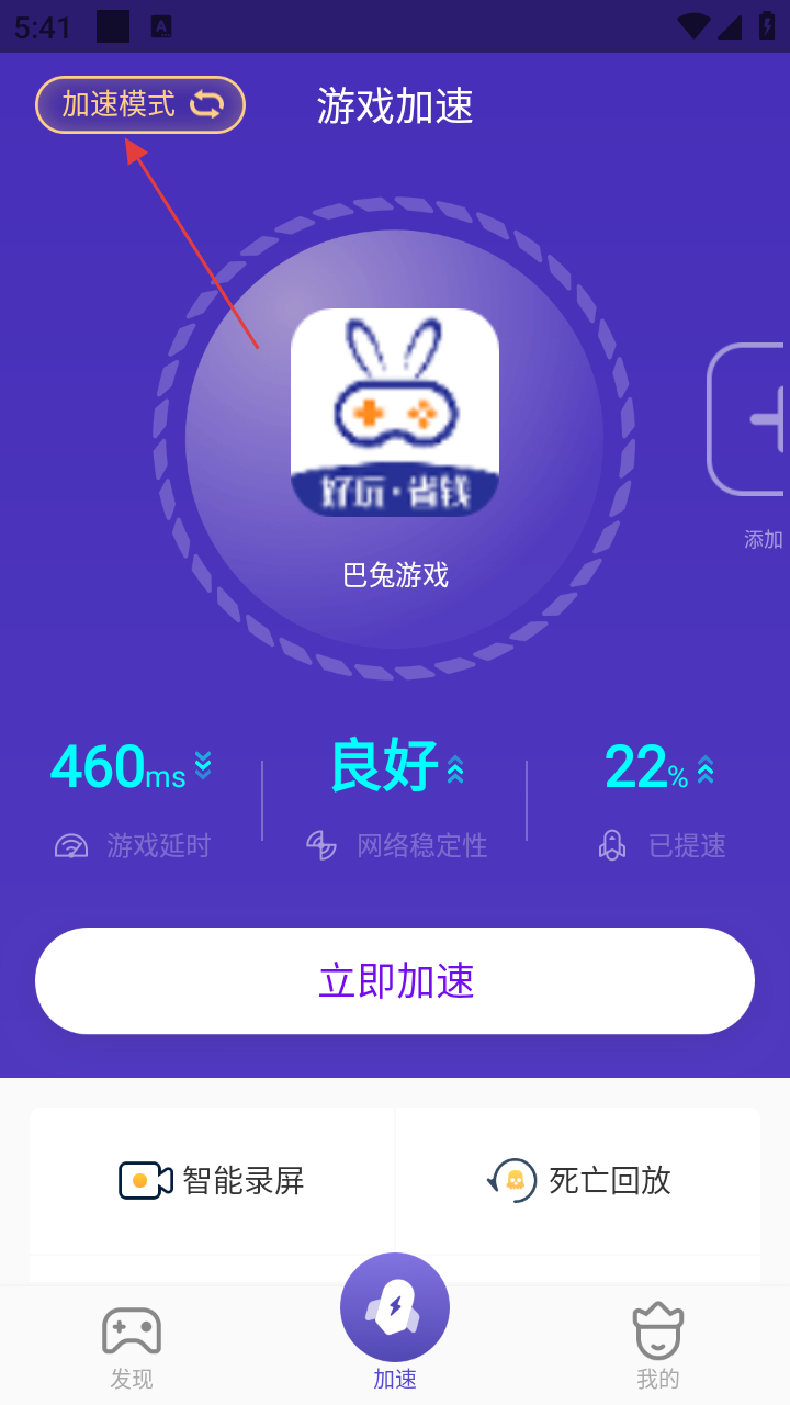 1、在游戏加速页面,点击【加速模式】,可进入加速模式切换界面,选择适合的加速模式。