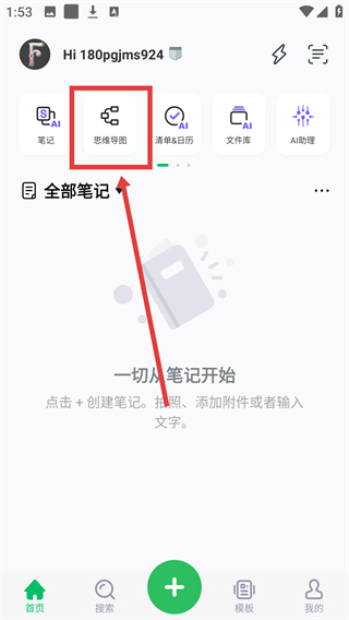 1、在首页点击【思维导图】选项,就能进入思维导图编辑页面,着手创建结构化的笔记内容啦。