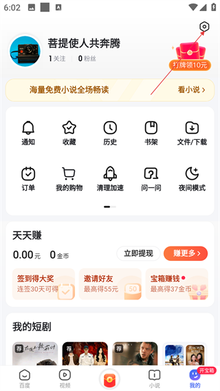 2、在【我的】页面,可使用【收藏】【历史】等功能管理内容,点击【设置】标志进入设置界面。