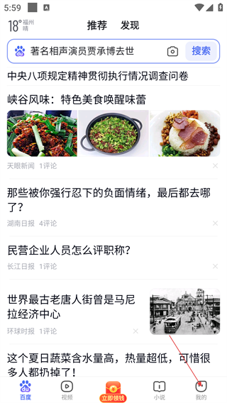 1、首页展示推荐资讯,涵盖美食、生活等内容,点击底部【我的】可进入个人中心,切换功能模块。