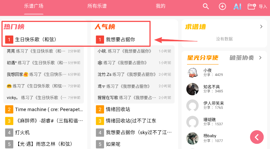 3、在热门榜和人气势区域,你能看到其他玩家最近在练习哪些热门曲目,为自己的练习选曲提供参考。