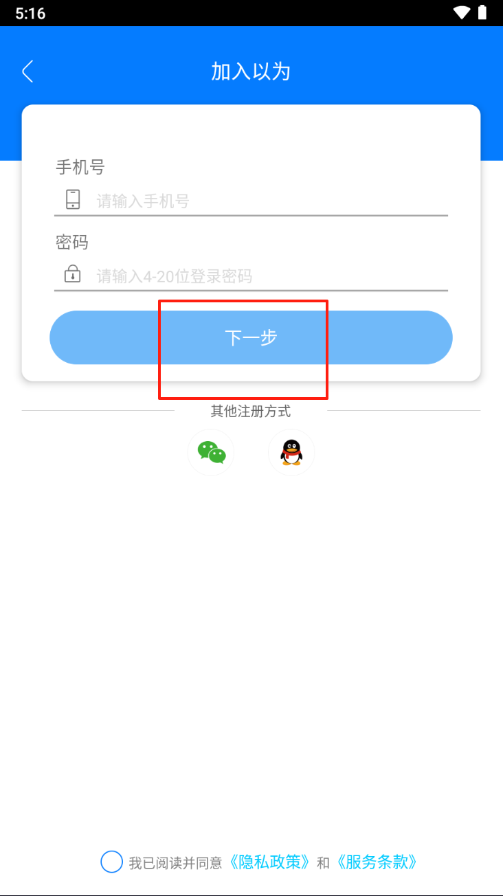 3、在注册页面输入手机号和密码,点击“下一步”完成注册。