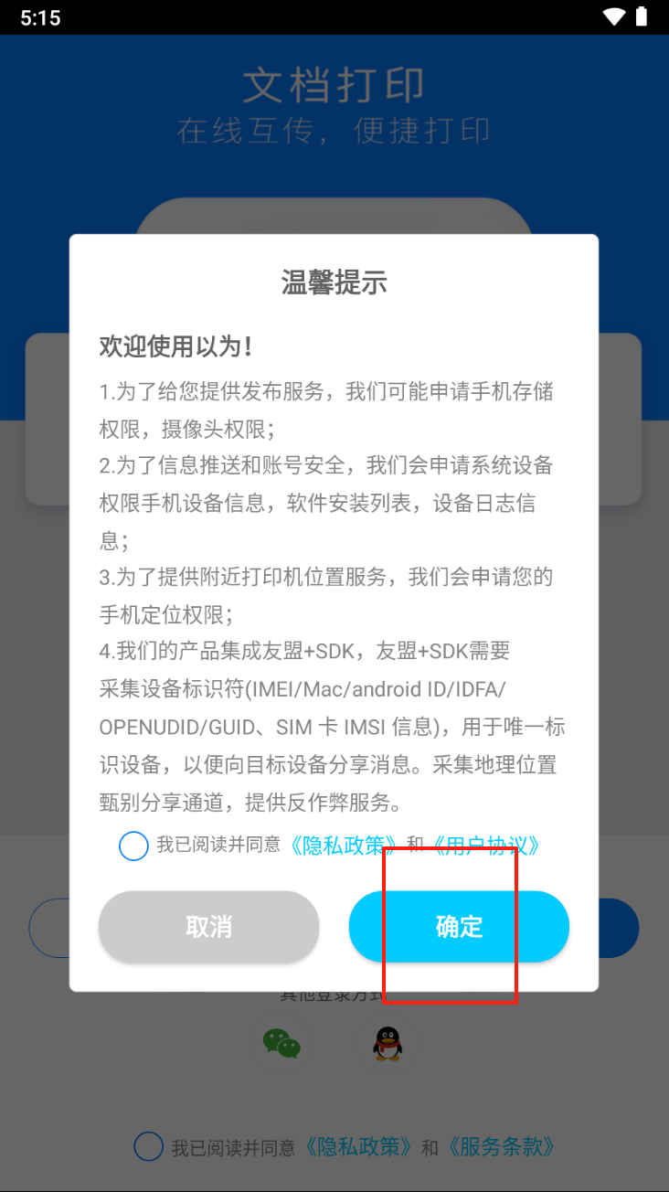 1、阅读并同意隐私政策。勾选同意《隐私政策》和《用户协议》后,点击“确定”继续。