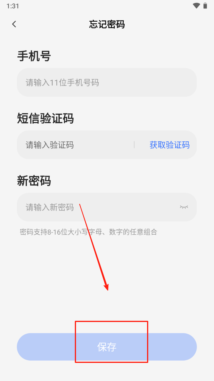 4、通过短信验证码重置密码:点击“保存”以更新并保存新密码。