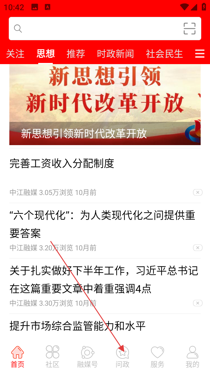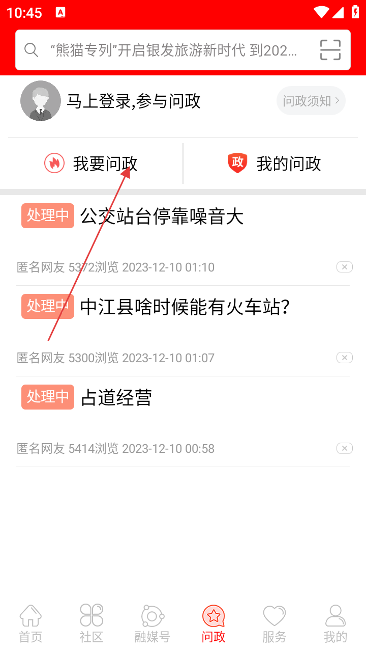 1、打开i中江,进入应用首页面,点击底部的【问政】,进入问政页。