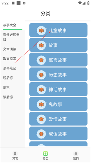 2、在分类界面,点击【儿童故事】,可进入儿童故事列表界面。