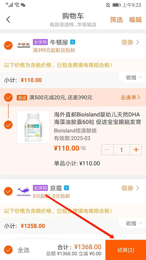 3、进入购物车界面,勾选好商品后,选择右下方“结算”即可下单买药了。