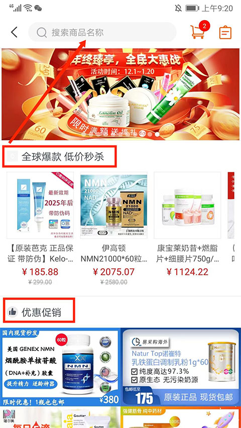 2、进入药品商城界面,可在下方查看需要的药品或者在上方“搜索框”搜索药品名称,选择右上角“购物车”选项,