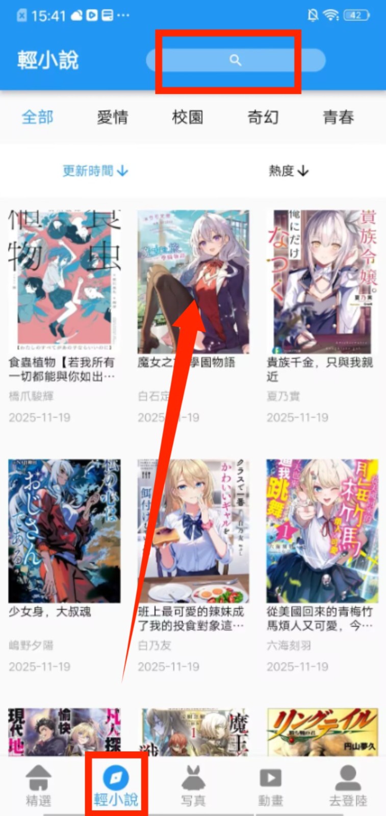 2、若对轻小说感兴趣,点击底部 “轻小说”,在顶部搜索栏可搜索想看的轻小说,也能按类型如爱情、校园等浏览。